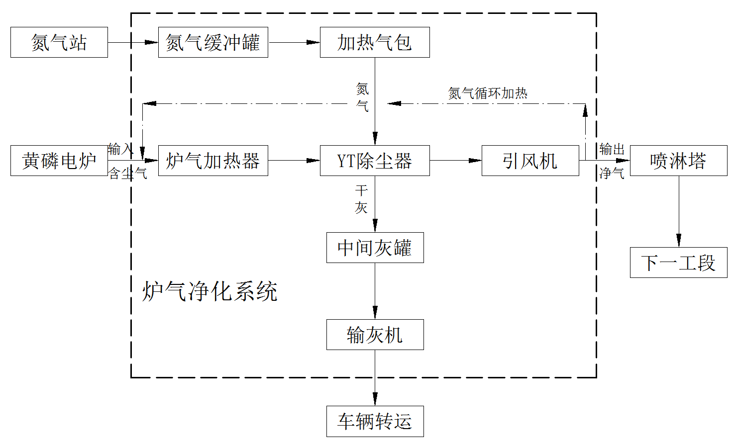 從黃磷電爐產(chǎn)生的含塵爐氣先通過爐氣加熱器加熱得到200℃以上的高溫爐氣,再進(jìn)入高溫YT除塵器凈化除塵,凈化后的高溫潔凈爐氣進(jìn)入噴淋塔進(jìn)行噴淋洗滌,洗滌下來的黃磷收集至沉降槽后再進(jìn)入下一工段處理,洗滌后的潔凈尾氣經(jīng)總水封保護(hù)后輸送至尾氣利用工段使用。氮?dú)鈴木彌_罐出來后進(jìn)入一體式加熱氣包,在氣包內(nèi)將氮?dú)饧訜岬皆O(shè)計(jì)溫度,加熱后的氮?dú)鈱?shí)行定時(shí)/定阻反吹,恢復(fù)膜通量。攔截下來的粉塵間接排入中間灰罐,并由中間灰罐冷卻暫存后定期排出系統(tǒng)作為生產(chǎn)原料或副產(chǎn)品。